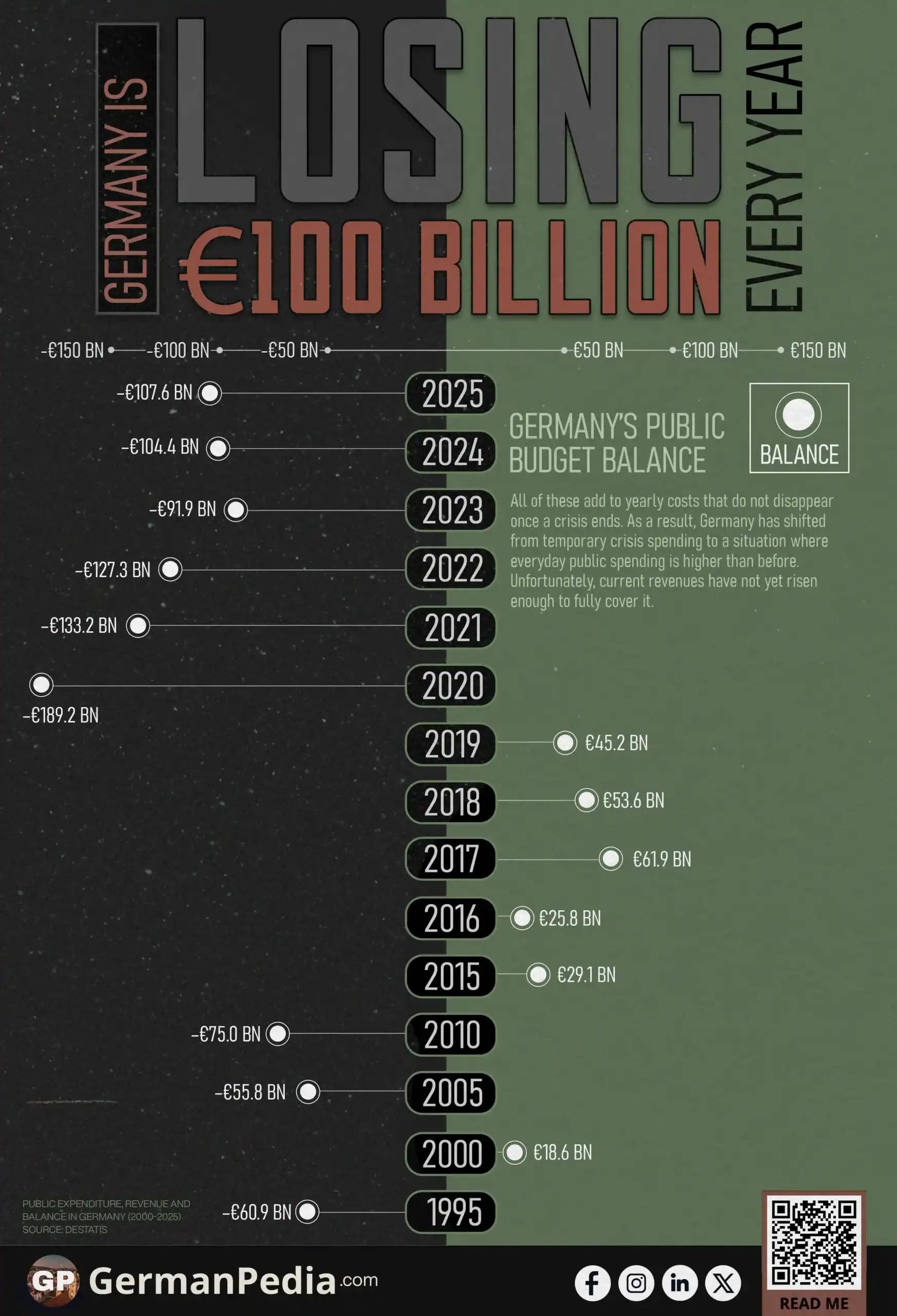 In the past six years, Germany's public budget has been negative. Germany has had a deficit of more than 100 billion euros every year since 2020. Read more ->