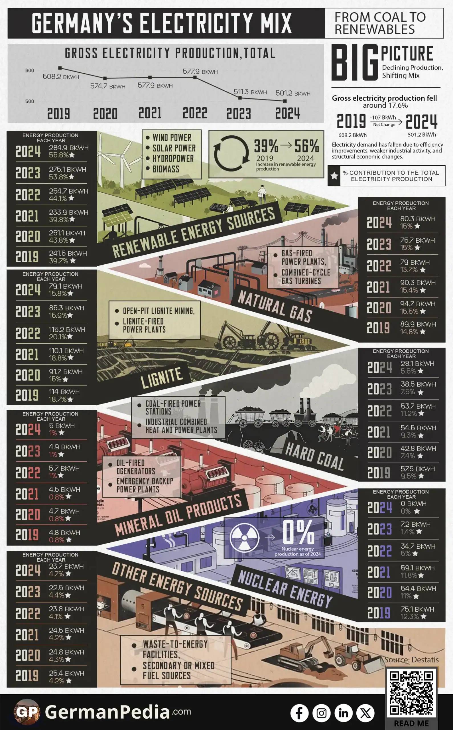 In China, electricity production has been steadily increasing, reaching 9,880 billion kWh in 2024. This is 20 times higher than in Germany.