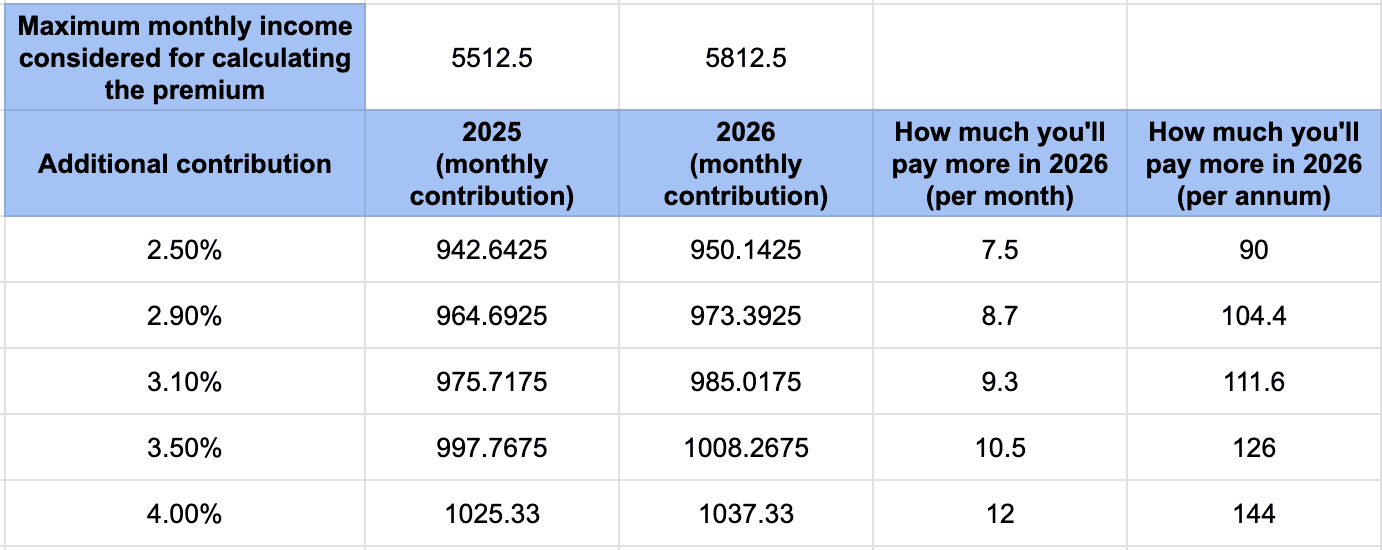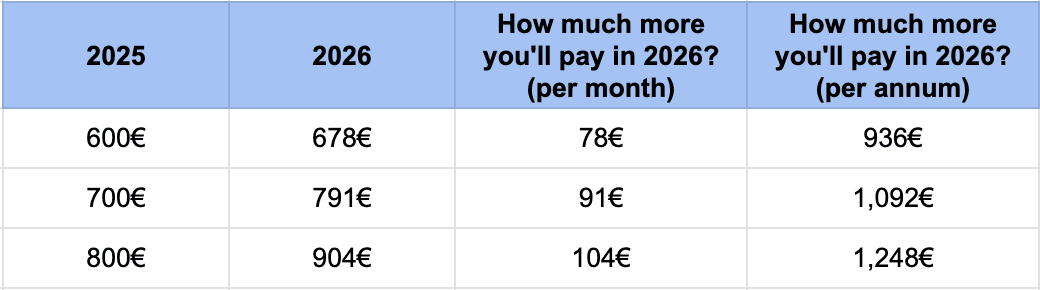 The table below shows how much more you'll pay every month in public health insurance in 2026. We assume you are earning more than 5812.5€ per month in 2026.