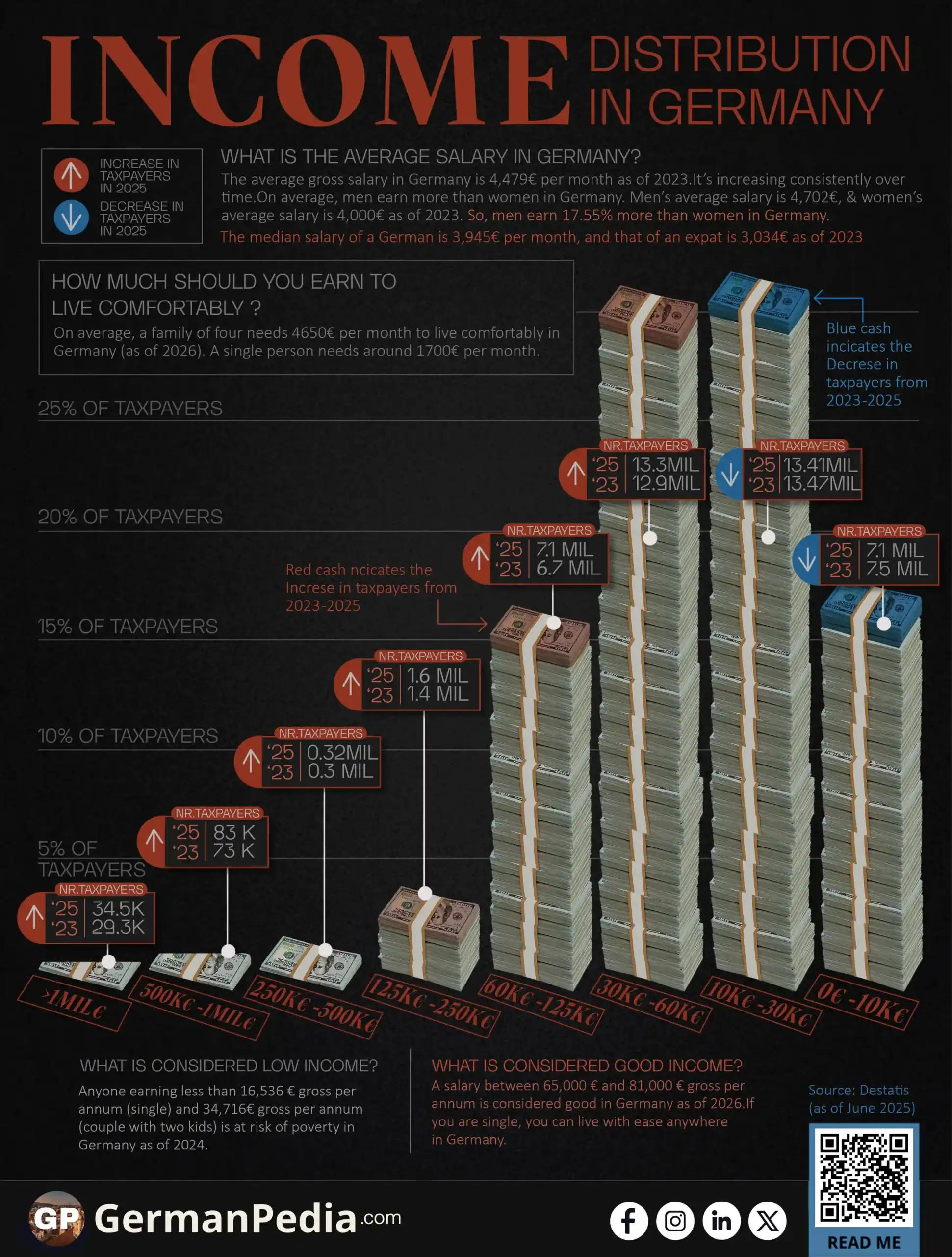 78.7% of people in Germany earn less than 60,000€ gross annually. Only 4.7% of people earn more than 125,000€ gross annually.